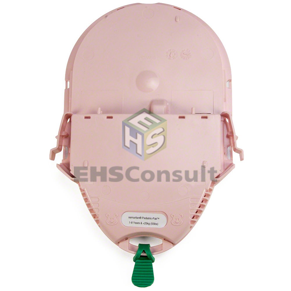 The Pediatric-Pak cartridge is intended for young patients—those aged 1 to 8 or under 25 kg (55 lbs). It integrates both the power source and child-sized electrode pads in a single unit, which streamlines upkeep and replacement procedures.
